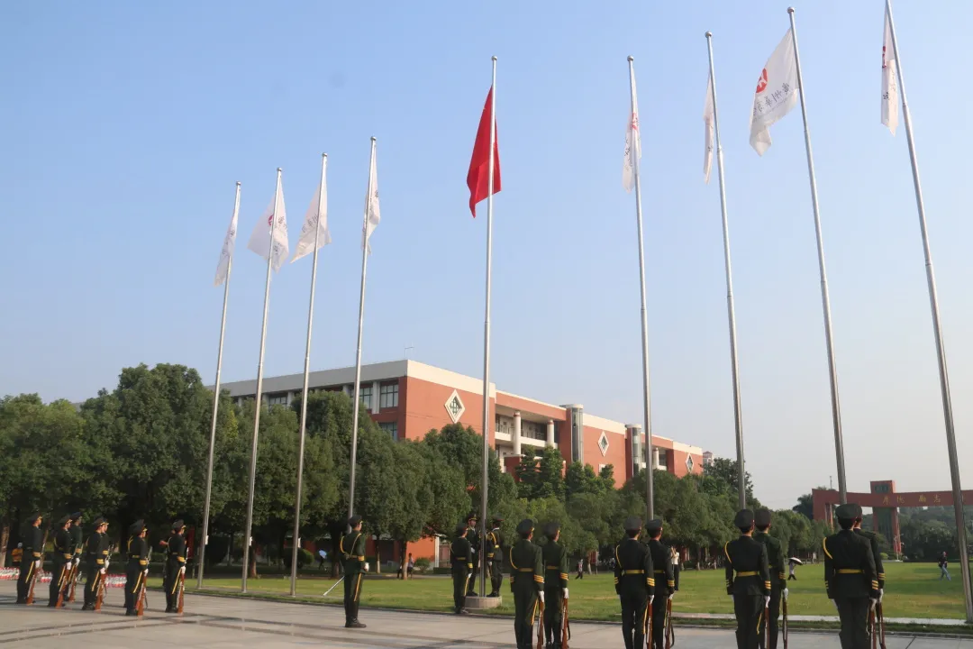 伴随着庄严的升旗仪式,全体肃立,奏唱国歌,行注目礼