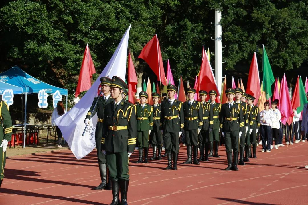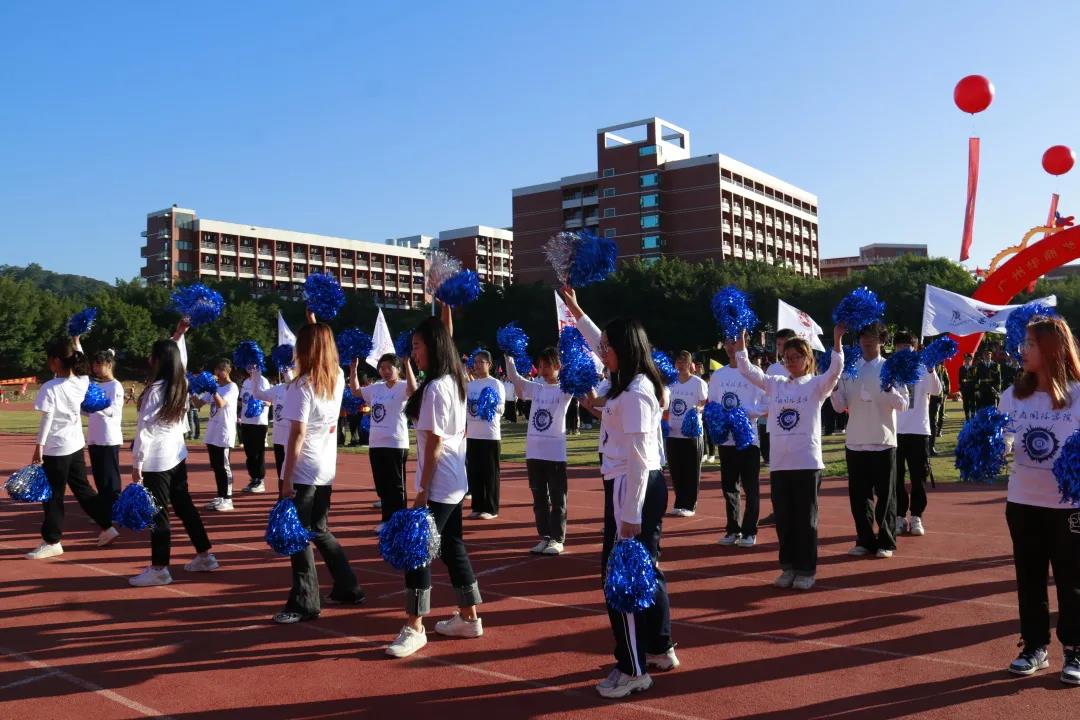 飘扬在体育场上空。全体校领导与师生面向国旗,共唱国