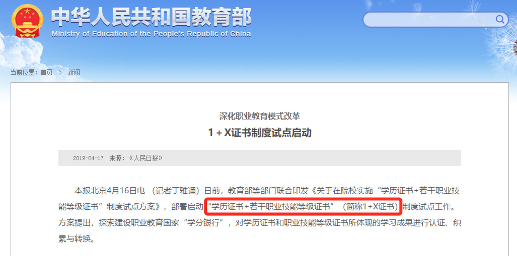 政策介绍:2019年4月,教育部等部门联合印发《关于在院校实施“学历证书+若干职业技能等级证书”制度试点方案》,部署启动“学历证书+若干职业技能等级证书”(简称1+X 证书)制度试点工作。