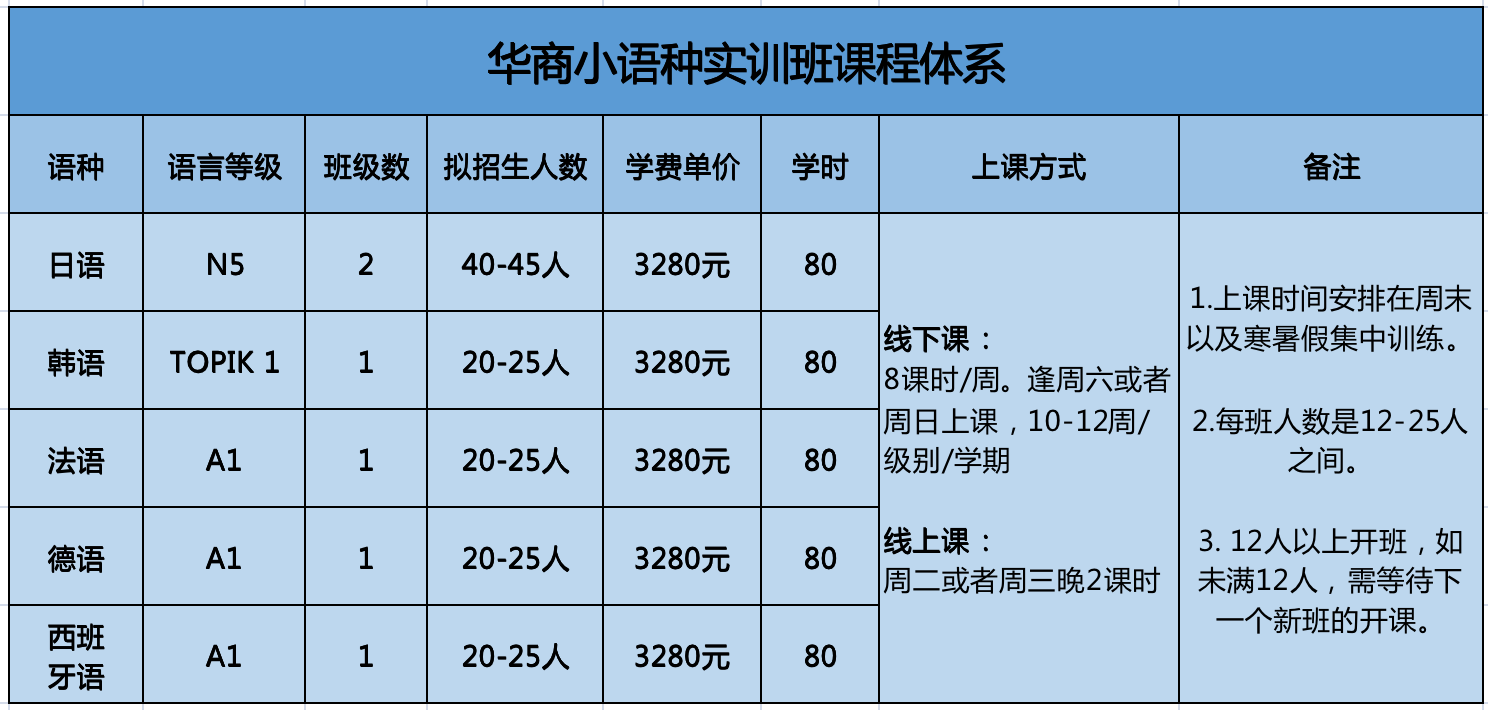 为深入贯彻落实国家战略方针及学校人才培养需要,丰富学生日常学习生活,提高学生语言学习兴趣,华商小语种实训班应运而生,在华商校内开设华商小语种实训班,面向全校招收有兴趣学习小语种的学生进行专项人才培养。