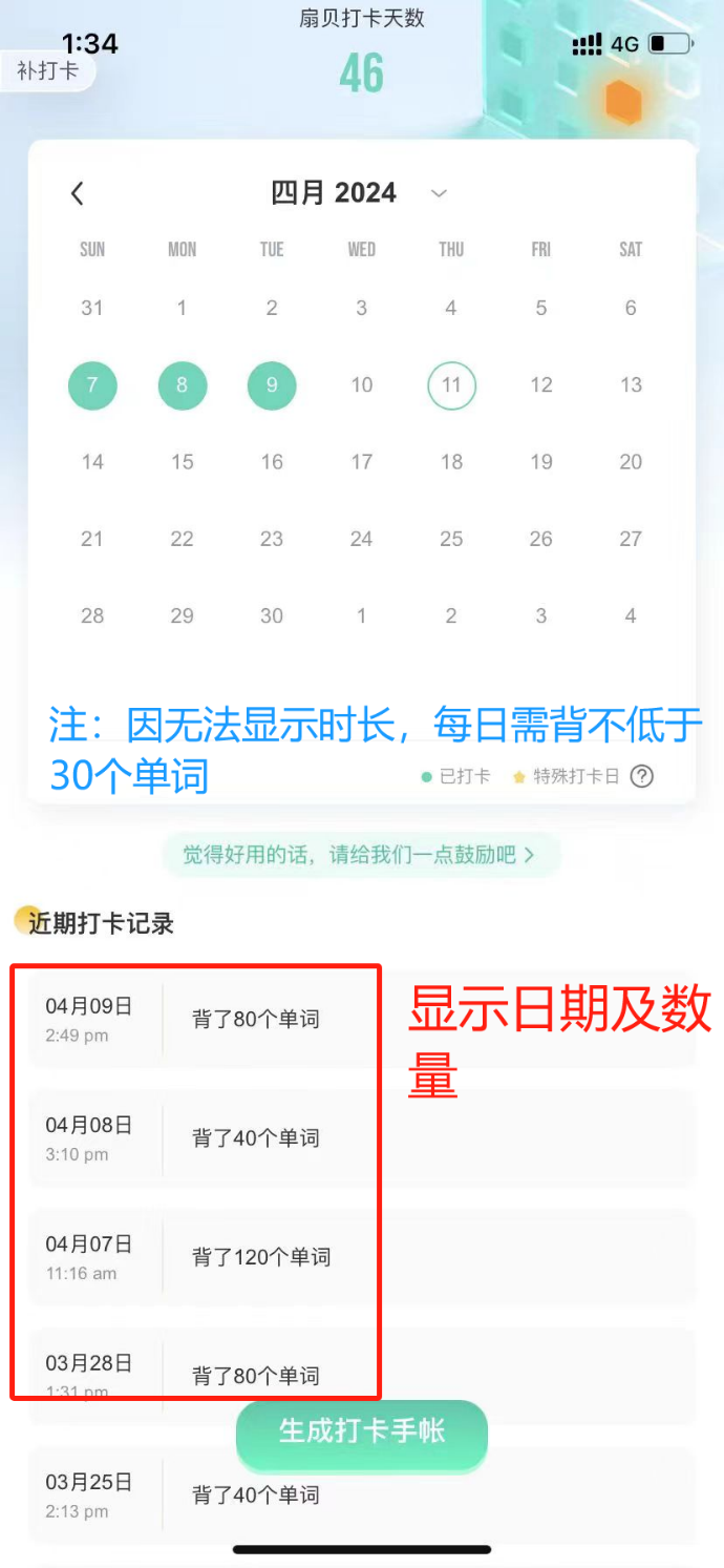 打卡上传的图片需能显示当天日期和学习单词量。不可用以前的打卡记录,必须要有当天对应的打卡记录。相关负责人员会仔细检查每日截图的单词量,用户和打卡时间,若发现雷同或作弊现象,直接取消加分资格。