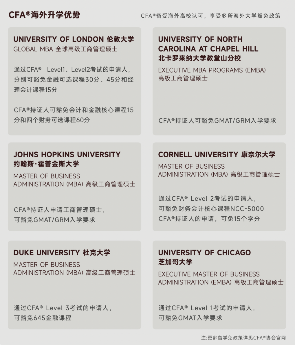 CFA/FRM除了能助力职业发展外,对留学深造也十分有用!通过CFA/FRM考试,相当于掌握了金融投资与风险两大领域的专业技能,深受海外金融高校青睐,并享受相关豁免政策。