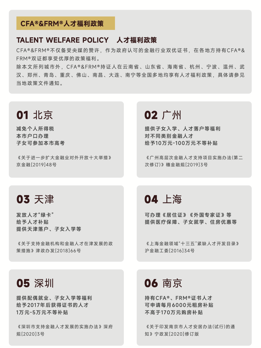 5.奖学金计划:CFA优秀奖学金,CFA单个级别总成绩在全球前10%及以上,或CFA所有科目考试成绩均在70%及以上,奖学金3.000元。FRM一级4个科目考试成绩均在1st,奖学金1500元,FRM二级6个科目考试成绩均在1st,奖学金2500元。