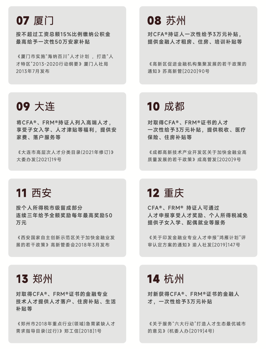 据WILEY官方统计,美国的FRM持证人年薪范围在$65,000~$195,000,平均工资是$86,000。从招聘网站查询得知,我国给予CFA、FRM持证人的待遇也更富有竞争力。