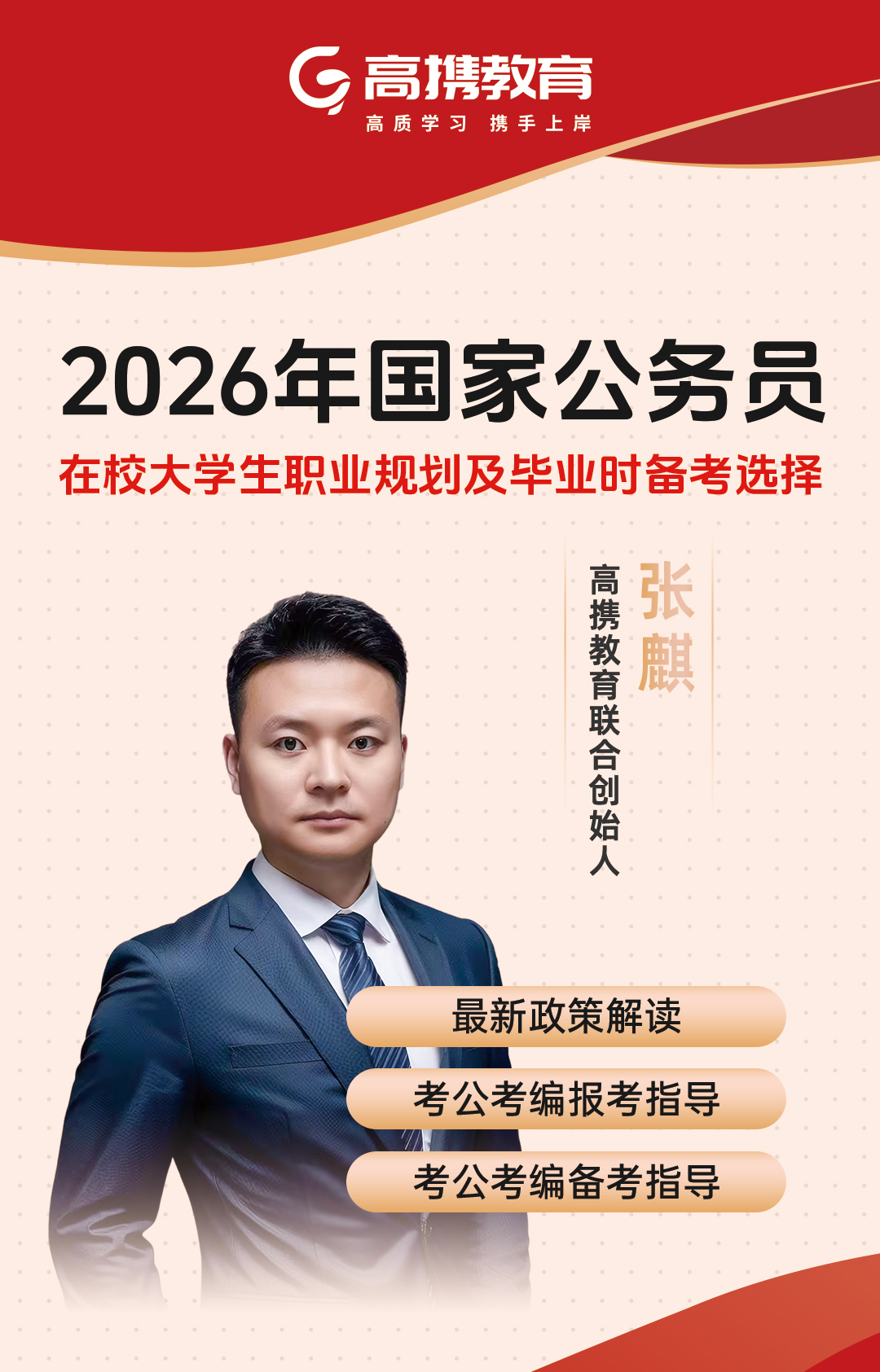 为了帮助各位同学破解困惑,高携教育联合创始人张麒老师从政策解读、职业规划到备考策略,提供一站式指导,助力同学们从大学校园到公职岗位的无缝衔接。