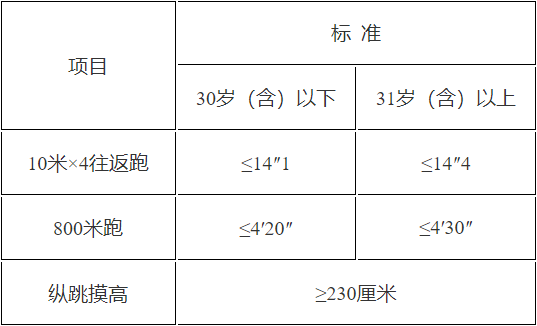 综合管理、执法勤务职位测查全部3个项目,警务技术职位免予测查1000米(男)/800米(女)跑项目;对专业人才紧缺难以形成竞争的特殊职位,经省级以上公务员主管部门同意,可以适当放宽体能测评有关项目标准或者免予测查体能测评项目;凡应测项目中任意一项不达标的,即为体能测评不合格。年龄计算时间截止到参加体能测评当月。